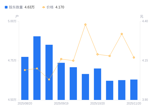 近一年(2024年11月20日至2025年11月20日),浙江交科A股股东户数从4.87万户,减低至4.63万户,降幅4.87%,区间股价下跌3.58%。