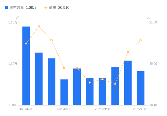 近一年(2024年11月29日至2025年11月10日),东亚药业A股股东户数从1.13万户,减低至1.08万户,降幅4.02%,区间股价上涨8.96%。