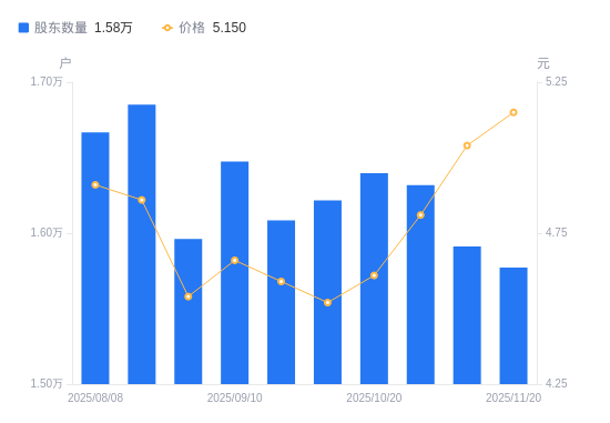 近一年(2024年11月20日至2025年11月20日),乔治白A股股东户数从1.95万户,减低至1.58万户,降幅19.14%,区间股价上涨11.47%。