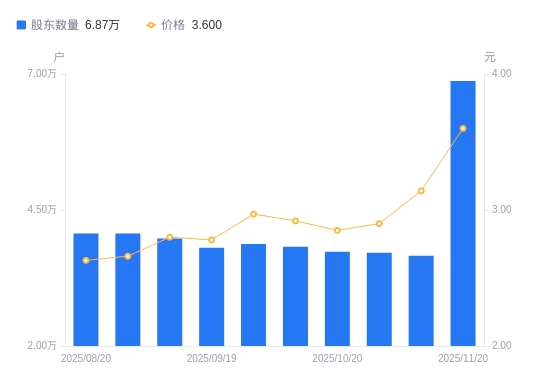近一年(2024年11月20日至2025年11月20日),华英农业A股股东户数从4.05万户,增加至6.87万户,增幅69.51%,区间股价上涨66.67%。