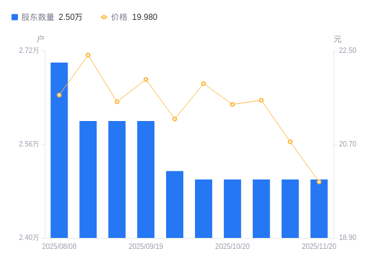 近一年(2024年11月29日至2025年11月20日),瑞普生物A股股东户数从1.6万户,增加至2.5万户,增幅56.25%,区间股价上涨1.90%。