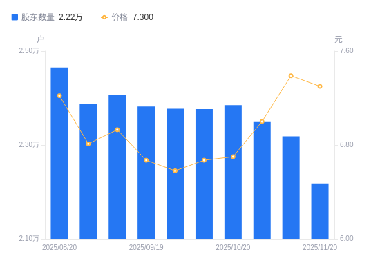 近一年(2024年11月20日至2025年11月20日),天禾股份A股股东户数从3.49万户,减低至2.22万户,降幅36.44%,区间股价上涨18.39%。