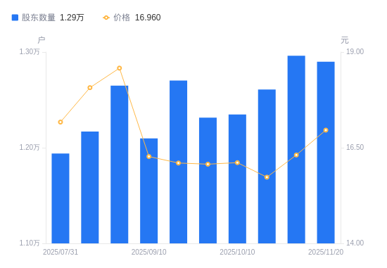 近一年(2024年12月31日至2025年11月20日),锐新科技A股股东户数从1.87万户,减低至1.29万户,降幅31.00%,区间股价上涨8.35%。