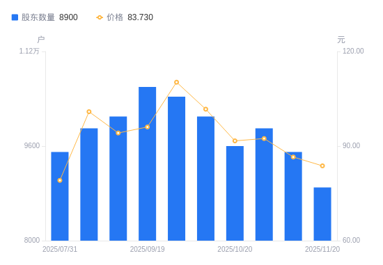 近一年(2024年11月29日至2025年11月20日),儒竞科技A股股东户数从1.2万户,减低至8900户,降幅25.83%,区间股价上涨39.81%。