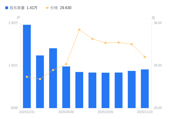 近一年(2024年12月31日至2025年11月20日),小方制药A股股东户数从2.46万户,减低至1.41万户,降幅42.70%,区间股价上涨14.18%。