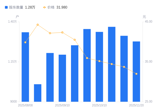 近一年(2024年11月20日至2025年11月20日),海泰科A股股东户数从8833户,增加至1.28万户,增幅44.55%,区间股价上涨38.50%。