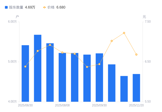 近一年(2024年11月20日至2025年11月20日),甘肃能源A股股东户数从5.47万户,减低至4.69万户,降幅14.21%,区间股价上涨10.96%。