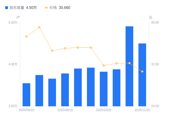近一年(2024年11月20日至2025年11月20日),中简科技A股股东户数从3.37万户,增加至4.5万户,增幅33.70%,区间股价上涨6.60%。