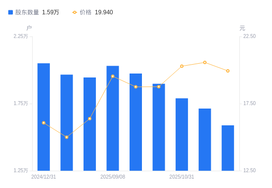 近一年(2024年12月31日至2025年11月20日),索宝蛋白A股股东户数从2.05万户,减低至1.59万户,降幅22.54%,区间股价上涨25.57%。