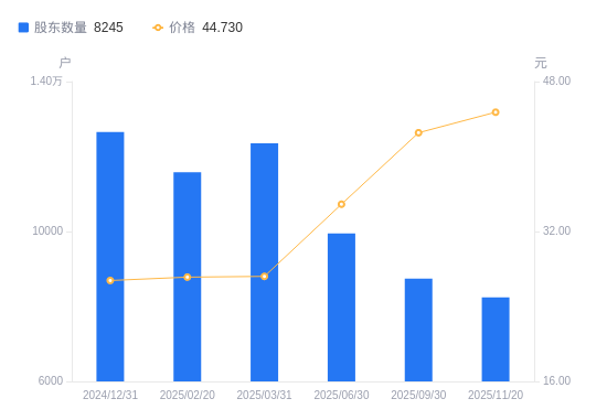 近一年(2024年12月31日至2025年11月20日),通灵股份A股股东户数从1.27万户,减低至8245户,降幅34.85%,区间股价上涨61.95%。