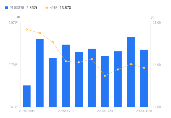 近一年(2024年12月20日至2025年11月20日),花园生物A股股东户数从3.23万户,减低至2.86万户,降幅11.47%,区间股价下跌11.07%。