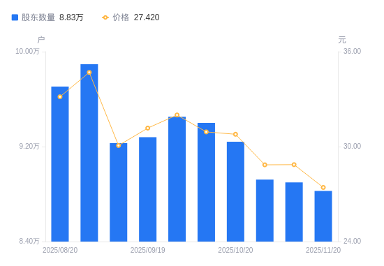 近一年(2024年11月20日至2025年11月20日),捷捷微电A股股东户数从11.11万户,减低至8.83万户,降幅20.54%,区间股价下跌24.15%。