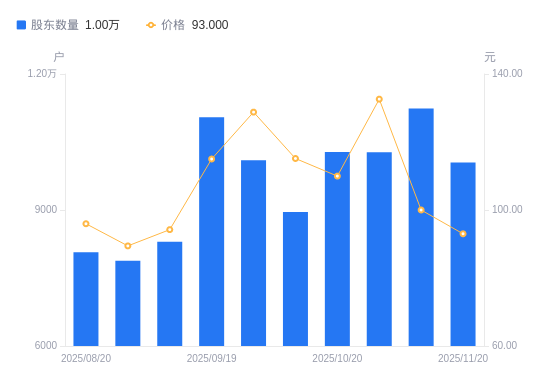 近一年(2024年11月20日至2025年11月20日),恒帅股份A股股东户数从9032户,增加至1万户,增幅11.23%,区间股价上涨52.85%。