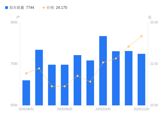 近一年(2024年11月29日至2025年11月20日),超越科技A股股东户数从9756户,减低至7744户,降幅20.62%,区间股价下跌10.15%。