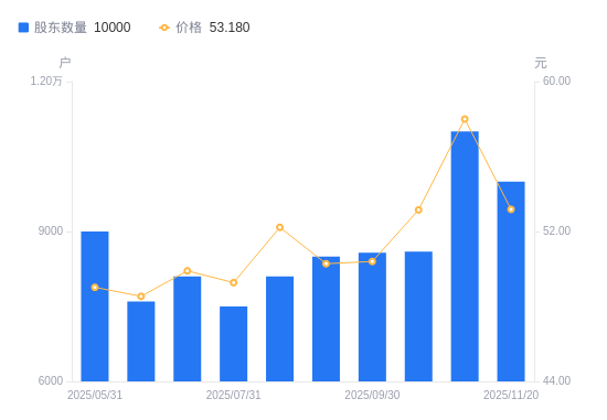 近一年(2024年11月20日至2025年11月20日),崇德科技A股股东户数从7700户,增加至1万户,增幅29.87%,区间股价上涨9.42%。
