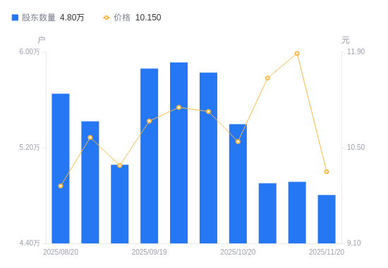 近一年(2024年11月20日至2025年11月20日),中原内配A股股东户数从5万户,减低至4.8万户,降幅3.93%,区间股价上涨64.77%。