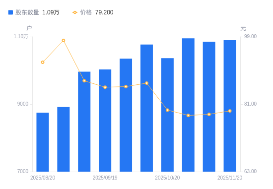 近一年(2024年11月29日至2025年11月20日),博隆技术A股股东户数从5887户,增加至1.09万户,增幅85.09%,区间股价上涨22.11%。