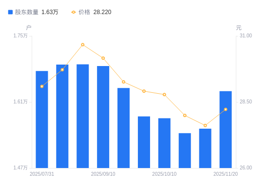 近一年(2024年11月20日至2025年11月20日),三元生物A股股东户数从1.38万户,增加至1.63万户,增幅18.46%,区间股价上涨6.65%。