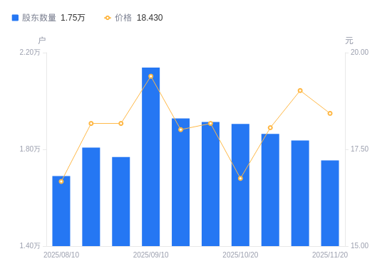 近一年(2024年11月20日至2025年11月20日),英力股份A股股东户数从2.13万户,减低至1.75万户,降幅17.51%,区间股价上涨20.46%。