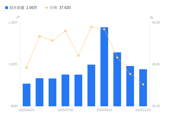 近一年(2024年11月20日至2025年11月20日),江南奕帆A股股东户数从6991户,增加至1.06万户,增幅51.54%,区间股价上涨3.06%。
