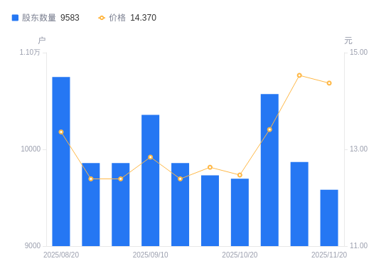 近一年(2024年11月20日至2025年11月20日),播恩集团A股股东户数从1.27万户,减低至9583户,降幅24.73%,区间股价上涨26.50%。