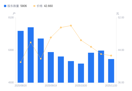 近一年(2024年11月20日至2025年11月20日),英华特A股股东户数从6360户,减低至5806户,降幅8.71%,区间股价上涨19.08%。