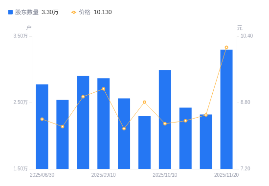 近一年(2024年11月20日至2025年11月20日),冀凯股份A股股东户数从1.57万户,增加至3.3万户,增幅109.90%,区间股价上涨76.48%。