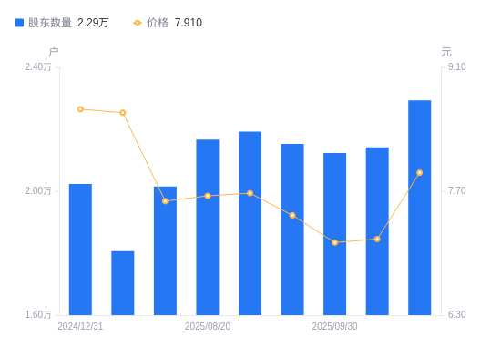 近一年(2024年12月31日至2025年11月20日),粤海饲料A股股东户数从2.02万户,增加至2.29万户,增幅13.36%,区间股价下跌13.53%。