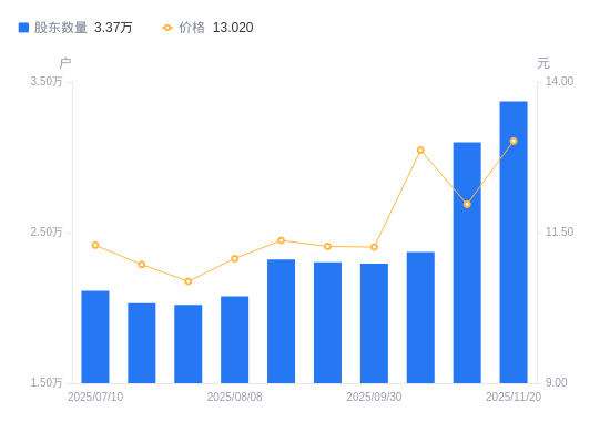 近一年(2024年11月20日至2025年11月20日),京能热力A股股东户数从1.98万户,增加至3.37万户,增幅70.22%,区间股价上涨9.98%。