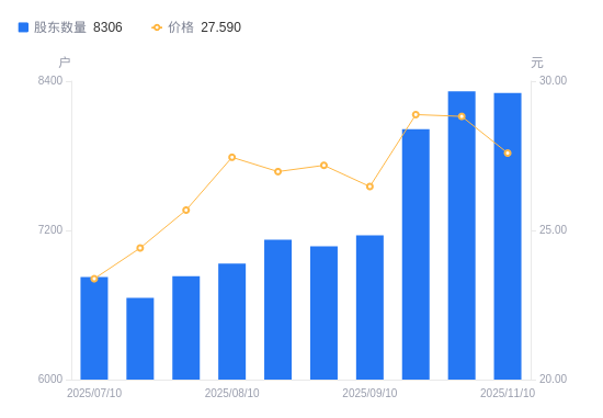 近一年(2024年11月10日至2025年11月10日),银河微电A股股东户数从7486户,增加至8306户,增幅10.95%,区间股价上涨11.60%。