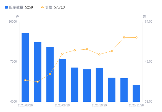 近一年(2024年11月29日至2025年11月20日),力聚热能A股股东户数从1.55万户,减低至5259户,降幅65.98%,区间股价上涨42.95%。