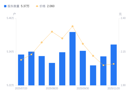 近一年(2024年11月29日至2025年11月20日),节能铁汉A股股东户数从6.06万户,减低至5.37万户,降幅11.44%,区间股价下跌16.94%。