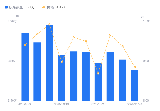 近一年(2024年12月10日至2025年11月20日),光韵达A股股东户数从4.75万户,减低至3.71万户,降幅21.82%,区间股价下跌8.67%。