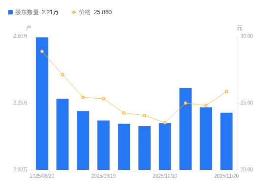 近一年(2024年11月20日至2025年11月20日),创识科技A股股东户数从2.27万户,减低至2.21万户,降幅2.45%,区间股价上涨16.52%。