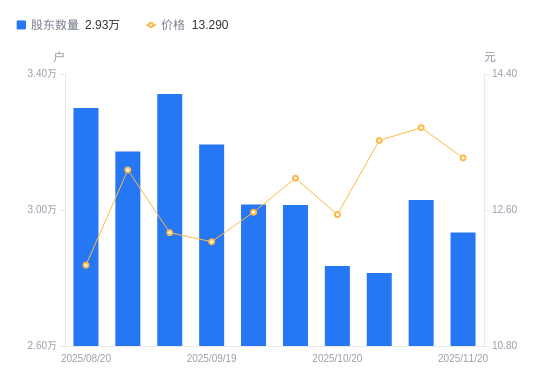 近一年(2024年11月20日至2025年11月20日),沃顿科技A股股东户数从2.57万户,增加至2.93万户,增幅13.97%,区间股价上涨52.01%。
