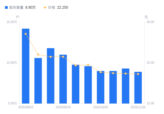 近一年(2024年11月20日至2025年11月20日),飞龙股份A股股东户数从5.7万户,增加至8.9万户,增幅56.14%,区间股价上涨111.70%。