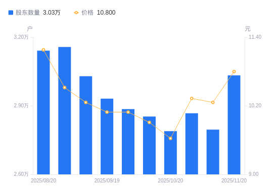 近一年(2024年11月20日至2025年11月20日),世纪天鸿A股股东户数从3.5万户,减低至3.03万户,降幅13.39%,区间股价下跌4.30%。