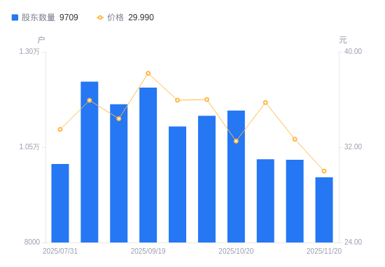 近一年(2024年11月20日至2025年11月20日),康平科技A股股东户数从8135户,增加至9709户,增幅19.35%,区间股价上涨35.76%。