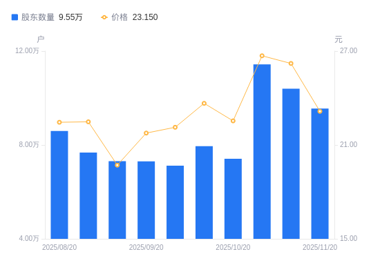 近一年(2024年11月20日至2025年11月20日),中电港A股股东户数从6.78万户,增加至9.55万户,增幅40.75%,区间股价上涨14.33%。