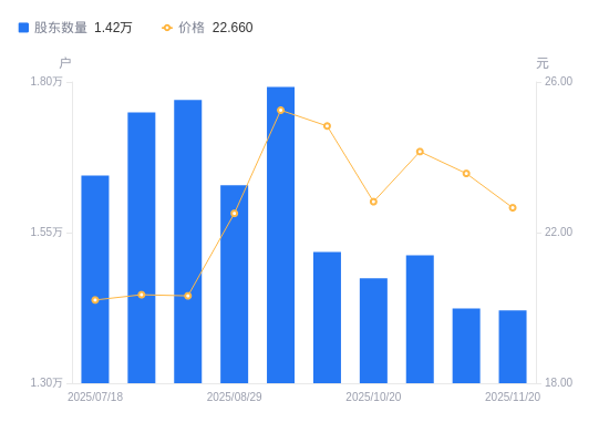 近一年(2024年12月10日至2025年11月20日),赛维时代A股股东户数从1.42万户,减低至1.42万户,降幅0.27%,区间股价下跌13.61%。