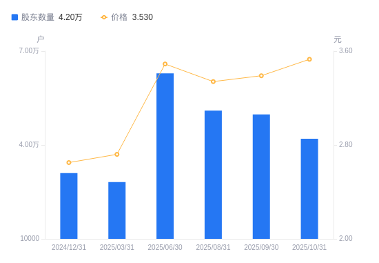 近一年(2024年12月31日至2025年10月31日),华纺股份A股股东户数从3.1万户,增加至4.2万户,增幅35.38%,区间股价上涨32.21%。