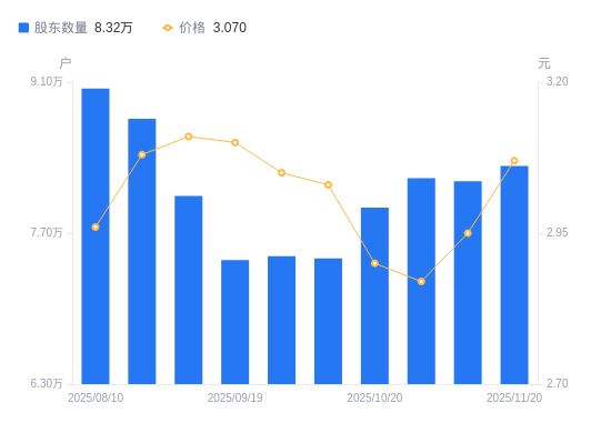 11月25日消息,数据显示,截至2025年11月10日,我爱我家A股股东总户数为8.18万户,较上期(2025年10月31日)减少298户,降幅0.36%。公司最新A股总股本为23.56亿股,其中流通A股22.56亿股,户均持有流通A股数量为2.76万股,较上期增加100.08股,增幅0.36%;户均持流通A股市值8.13万元,较上期增加2493.26元,增幅3.16%。