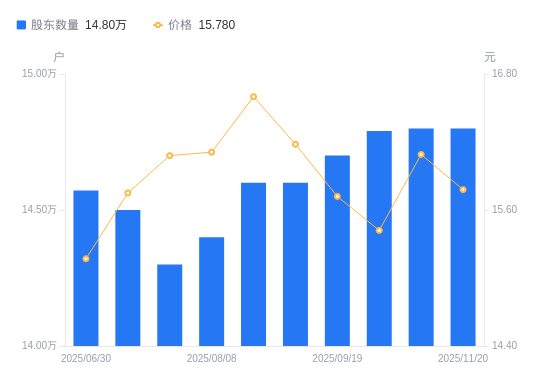 近一年(2024年11月20日至2025年11月20日),华兰生物A股股东户数从15.3万户,减低至14.8万户,降幅3.27%,区间股价下跌3.37%。