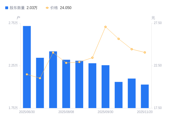 11月25日消息,数据显示,截至2025年11月20日,迅游科技A股股东总户数为2.03万户,较上期(2025年11月10日)减少711户,降幅3.39%。公司最新A股总股本为2.03亿股,其中流通A股1.69亿股,户均持有流通A股数量为8318.07股,较上期增加281.96股,增幅3.51%;户均持流通A股市值20万元,较上期增加3727.46元,增幅1.90%。
