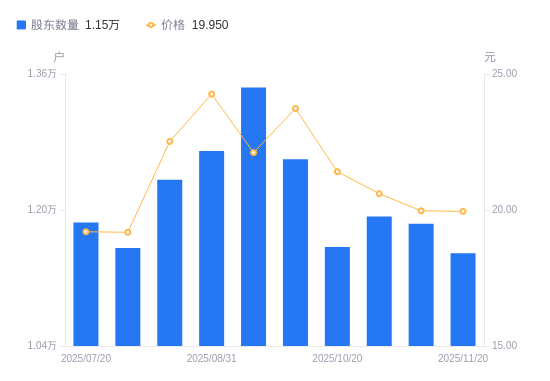 近一年(2024年11月20日至2025年11月20日),铭利达A股股东户数从1.07万户,增加至1.15万户,增幅7.82%,区间股价上涨3.15%。