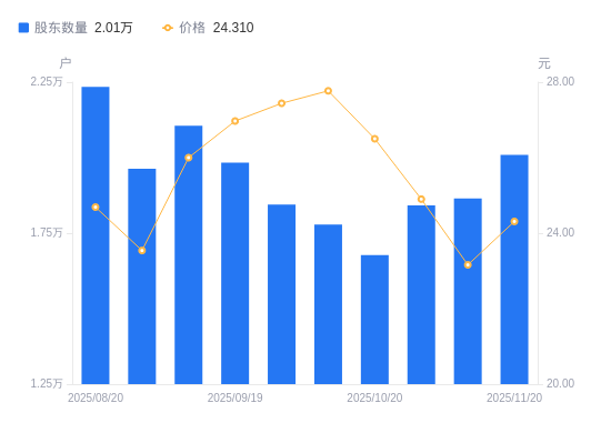 近一年(2024年11月20日至2025年11月20日),华纬科技A股股东户数从9365户,增加至2.01万户,增幅114.52%,区间股价上涨62.80%。