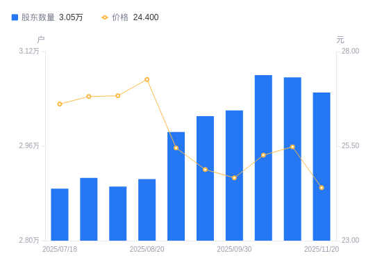 近一年(2024年11月29日至2025年11月20日),博雅生物A股股东户数从2.5万户,增加至3.05万户,增幅22.07%,区间股价下跌19.97%。