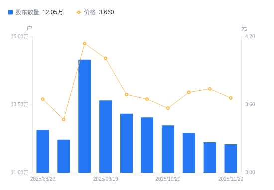 近一年(2024年11月20日至2025年11月20日),大东南A股股东户数从6.47万户,增加至12.05万户,增幅86.08%,区间股价上涨42.41%。