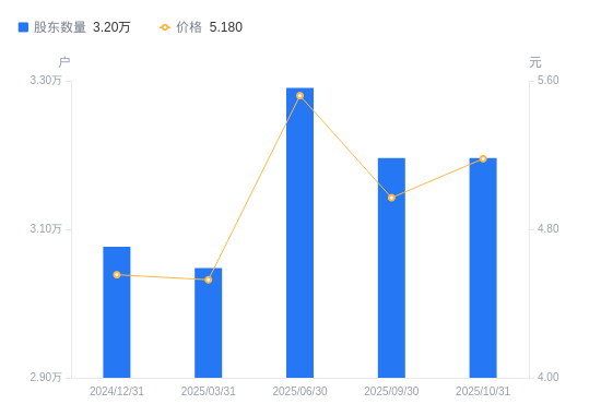 近一年(2024年12月31日至2025年10月31日),苏农银行A股股东户数从3.08万户,增加至3.2万户,增幅3.88%,区间股价上涨11.04%。