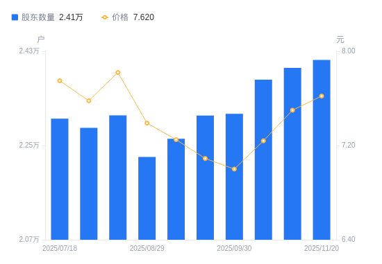 近一年(2024年11月20日至2025年11月20日),博深股份A股股东户数从2.24万户,增加至2.41万户,增幅7.82%,区间股价上涨12.06%。